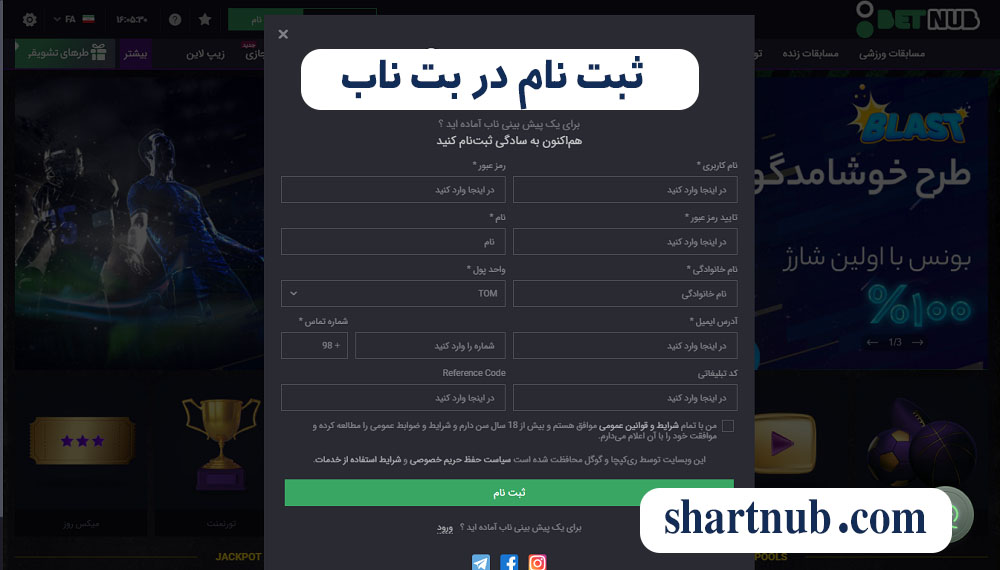 برای ثبت نام در سایت شرط بندی بت ناب BetNub ابتدا به بخش مربوط به ثبت نام مراجعه کنید و در آنجا شما باید اطلاعاتی را که در پنل ثبت نام از شما خواسته شده را وارد نمایید. این اطلاعات شامل: